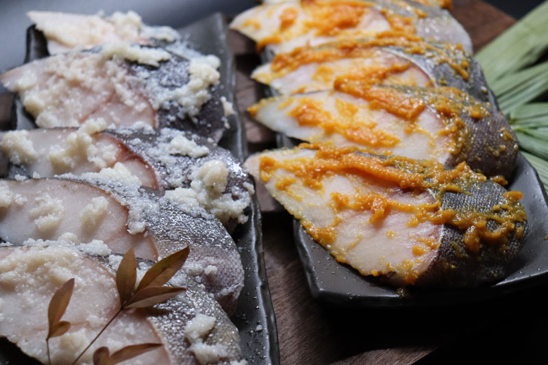 生時1.5~2kg前後の大きな銀だらを厳選して使用。当店自慢の『甘さを抑えた西京味噌』と、『素材の旨味を引き出す塩糀』にて漬けました。