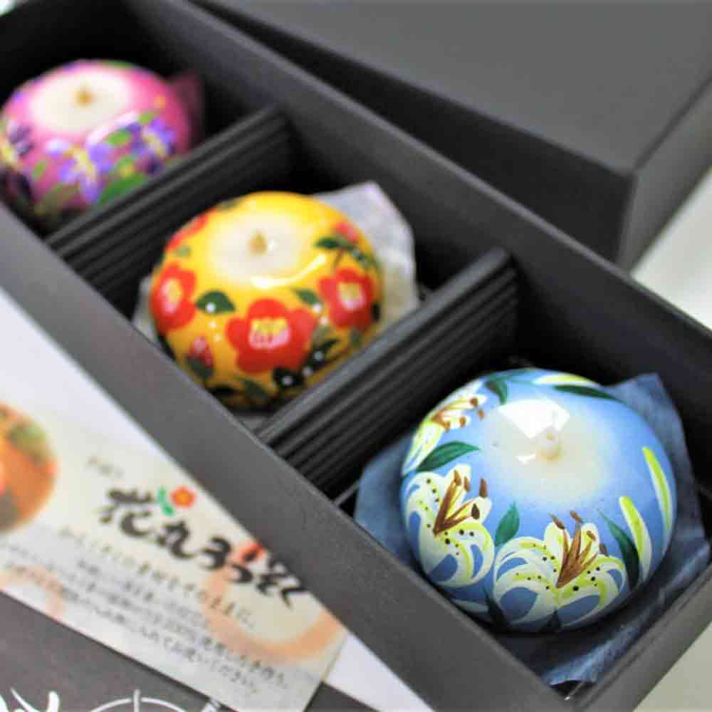 手描きの美しさと灯る炎と昔ながらの光、和菓子のような丸くてコロンとした可愛らしい花丸ろうそく3個入りギフトです。