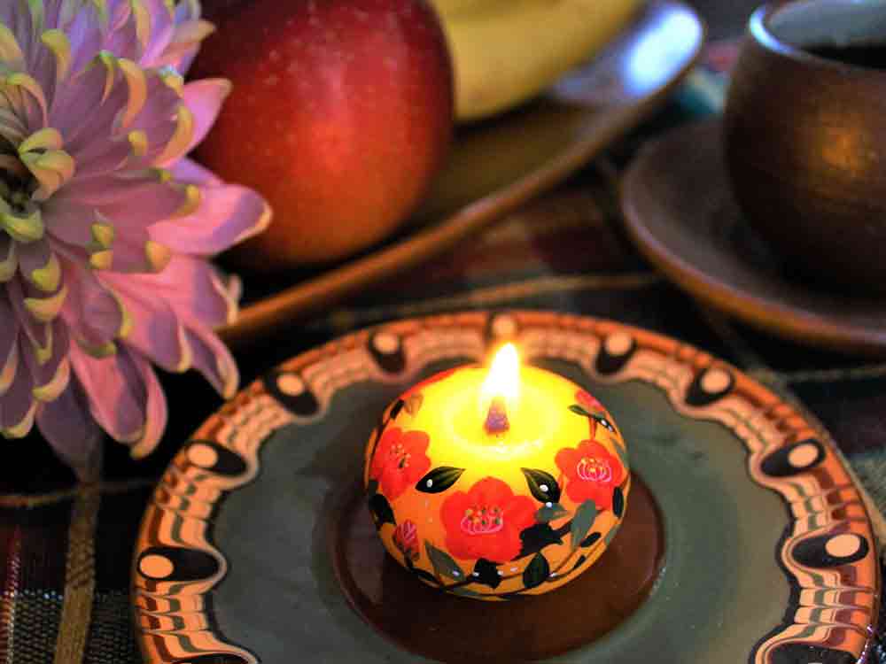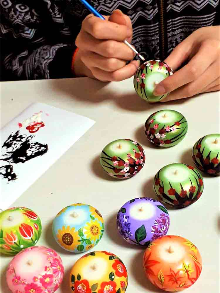 雪国伝統の花ろうそく。雪深い地域でお仏壇にお供えするお花の代わりに少しでも華やかにという気持ちからろうそくに花の絵を描くようになったと言われています。灯して消えていくお花は、煙となって大切な人に届くと言い伝えられています。