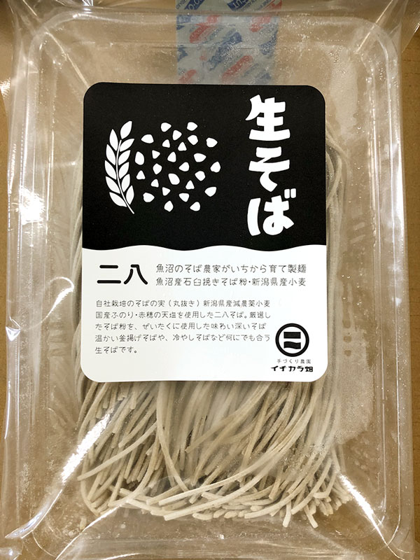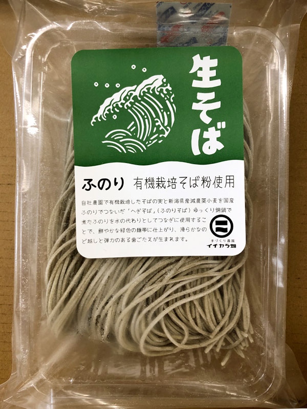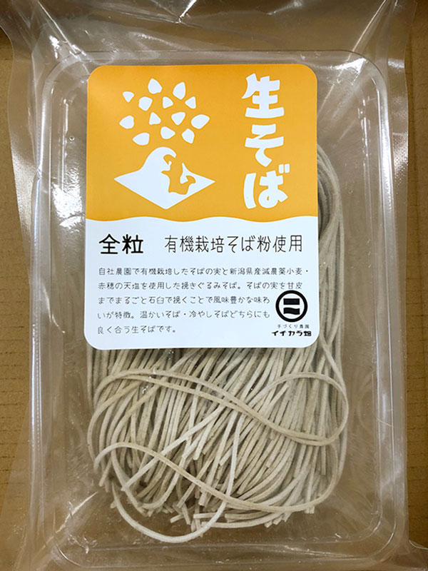 小千谷市の自社農園で有機栽培した玄そばを石臼挽きし、国産原料のみで繋いだ生そば。