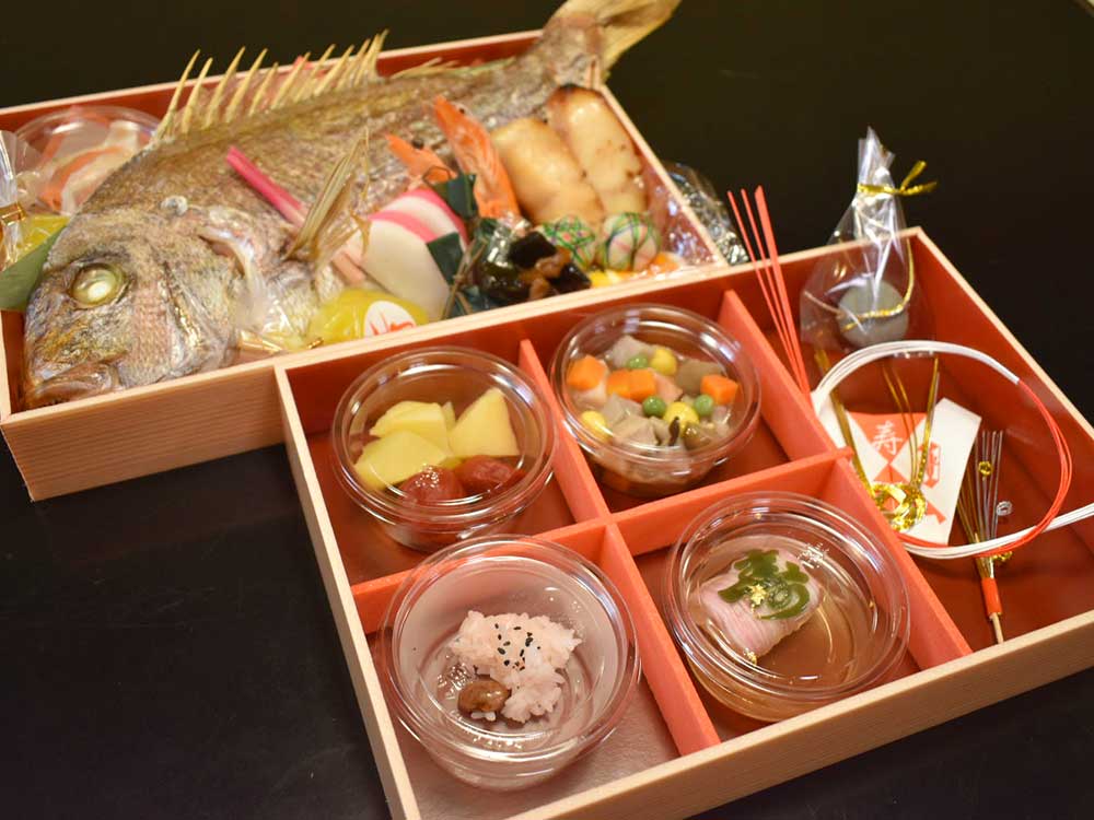 尾頭44cm前後の大ぶりな鯛を塩焼きにし、それぞれ盛り付けるとテーブルも豪華に華やかとなります。尾頭飾り、祝い箸、説明書き、盛り付け例なども用意され迷うこともありません。