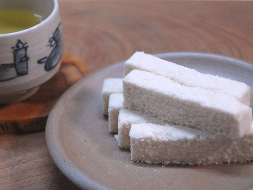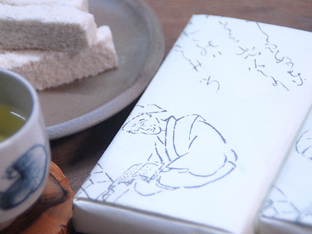 「七人目白雪こうで育て上げ」(柳多留) の川柳があるように、江戸時代には砕いて湯にとかしたものが母乳の代用にされました。大黒屋の「白雪こう」は砂糖に飴蜜を混ぜて水分を補い、米粉と山芋の粉などを加えて、型で押し固めた一品です。口に入れれば雪のように溶ける食感を堪能ください。