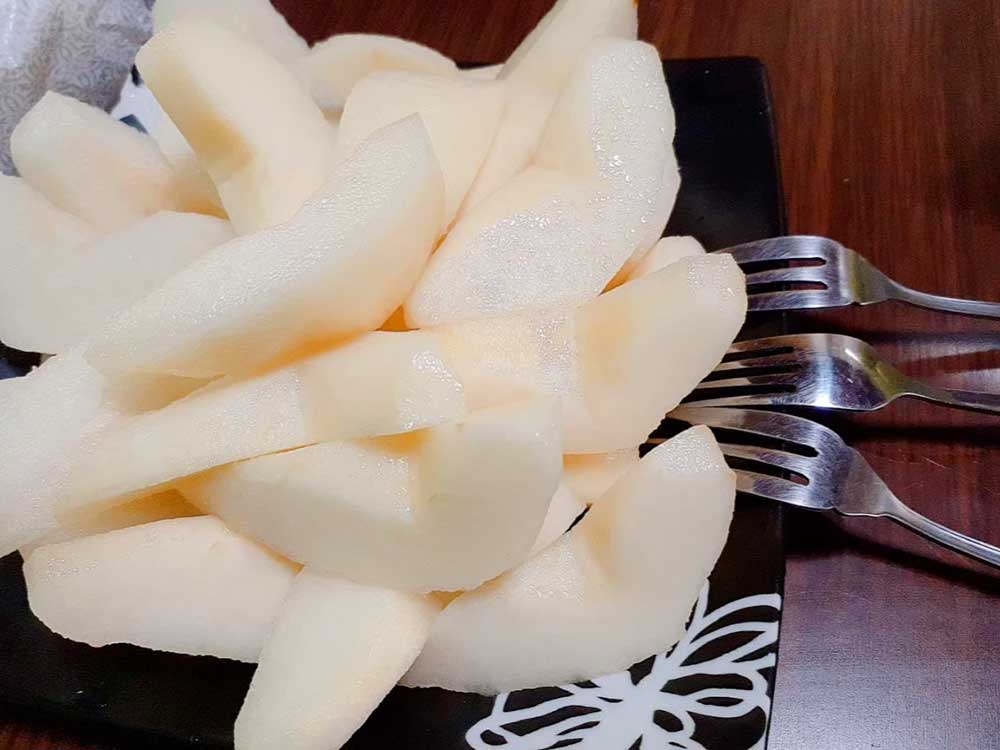 芳醇な甘い香りが強く、肉質は柔らかくまろやかです。多汁で酸味が少なく、甘みが特に強いのが特徴で、ラ・フランスより甘いと言われています。