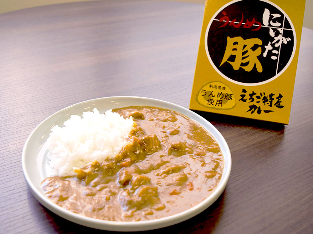 徹底された管理体制の中、ゆったりと伸び伸びと育てられた肉質はほどよく柔らかく、上品な香りとさっぱりとした脂肪が特徴。「うんめ!」とは新潟の方言で「うまい!」「おいしい!」を意味する。「うんめ豚」の旨みを味わえる中辛カレー♪