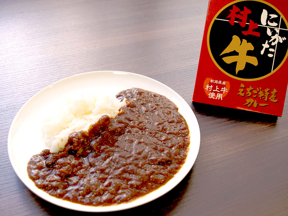 黒毛和牛の中でも、格付等級A-4・B-4以上の品質であるものを「村上牛」と呼んでおり、全国肉用牛枝肉共励会で最高位の名誉賞を受賞した経歴のあるお肉。豊かな風味、深い味わいの村上牛の旨みがぎっしり詰まった中辛カレー♪