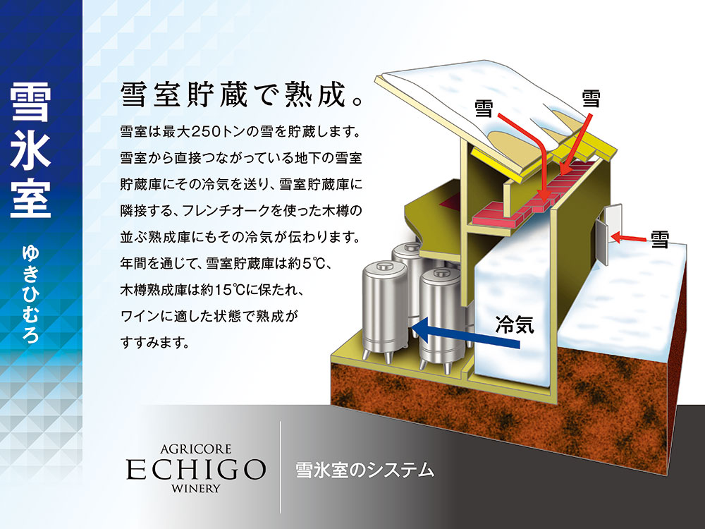 • 雪国ならではの雪氷室の冷気を使用し、通年雪室貯蔵庫は約5℃、樽貯蔵庫内は約15℃、湿度75%以上で低温貯蔵・熟成をおこなっている 「雪室貯蔵ワイン」