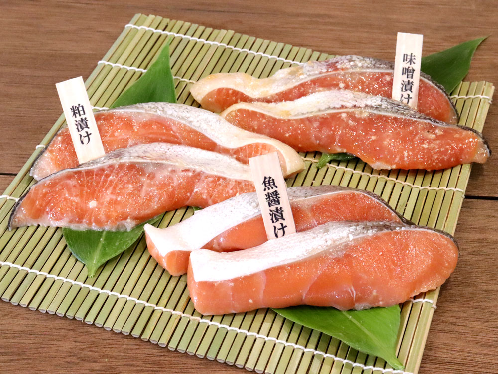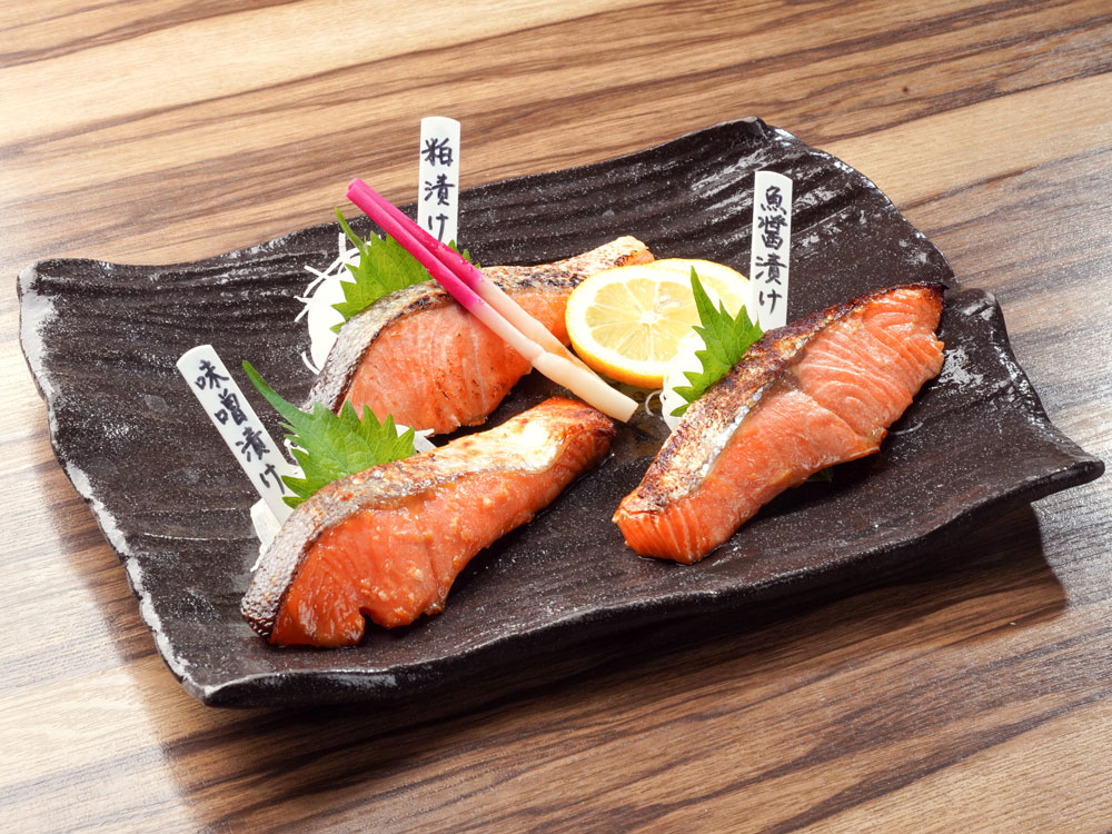 - 魚醤に付け込んだサーモンを地元酒蔵の熟成「練り粕」に漬けた香り高い粕漬け