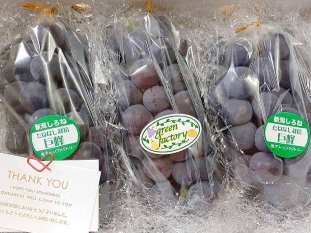 日本一長い信濃川によって育まれた養分のバランスが整っている土壌と、夏の暑さ、そしてたっぷりの水分が、あふれる甘さの優しい果物を実らせています。日の光をいっぱいに浴び、私達が丁寧に育てた美味しい『種なし巨峰』を、ぜひ一度味わってみて下さい。 グリーンファクトリーのぶどうは、『甲斐路』以外は、全て種なし栽培となっております。誕生日、記念日、ハロウィン、クリスマスetc 各種イベントにぴったりなラッピングも承ります。