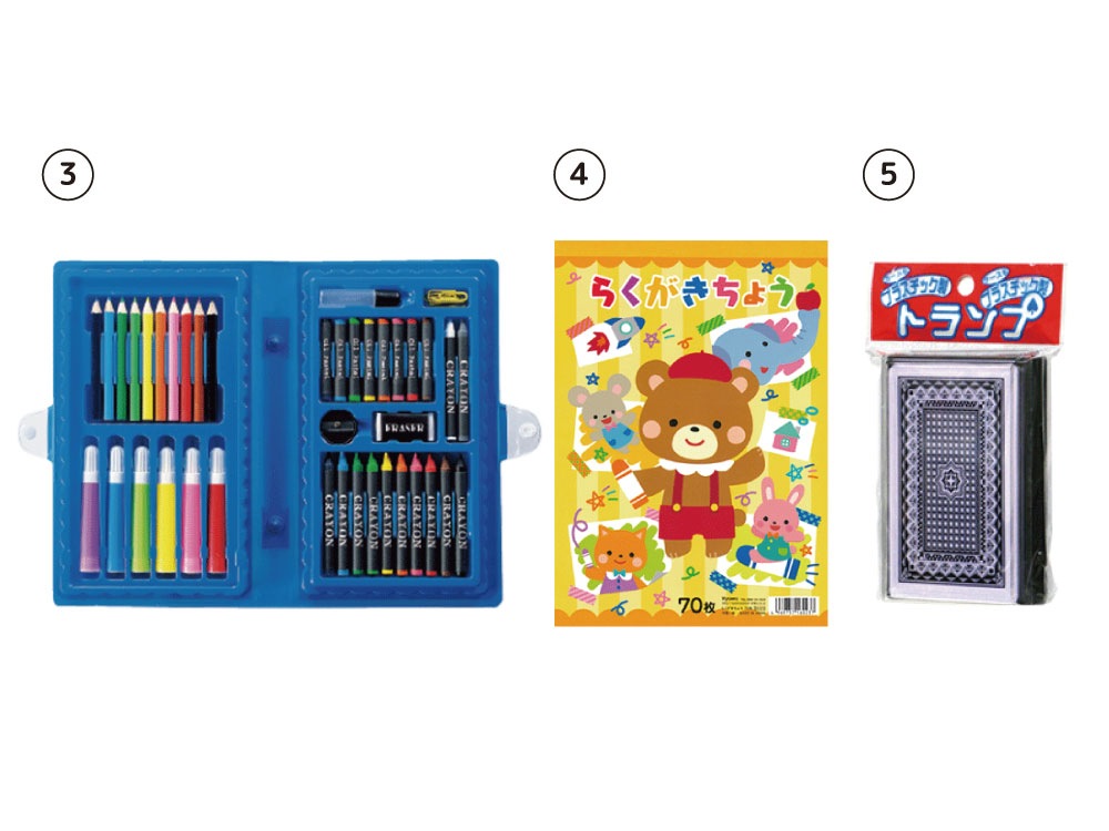 クレヨン12色、消しゴム、色鉛筆10色など、お絵描きを楽しめるセット
