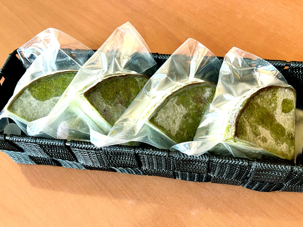 - 冷凍のままパッケージから出し、容器に移して冷気が当たらないように蓋をしてから冷蔵解凍してください。