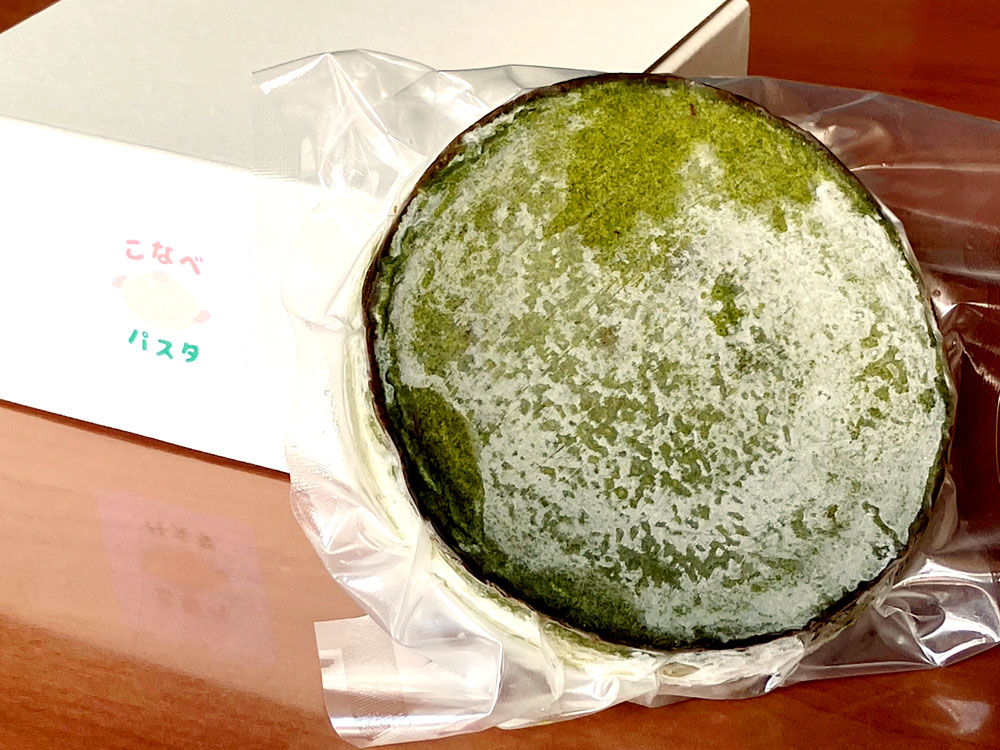 パスタソースをメインに扱っているお店が作る「抹茶のバスク風濃厚チーズケーキ」。お茶の席で頂くお茶菓子とお茶を一つで表現できないか、試作を何度も繰り返し、ようやく納得いく作品に仕上げました。キリッとした抹茶の香りが鼻孔をくすぐり、口に入れたとたん甘い生地が滑らかに溶けだします。後味は抹茶ティーラテを連想させてくれます。抹茶が苦手な方でも、美味しく頂けるよう工夫しました。ご注文の際は「ワンホール」か「1/4カットを4つ」かを選べます。ぜひご賞味ください。